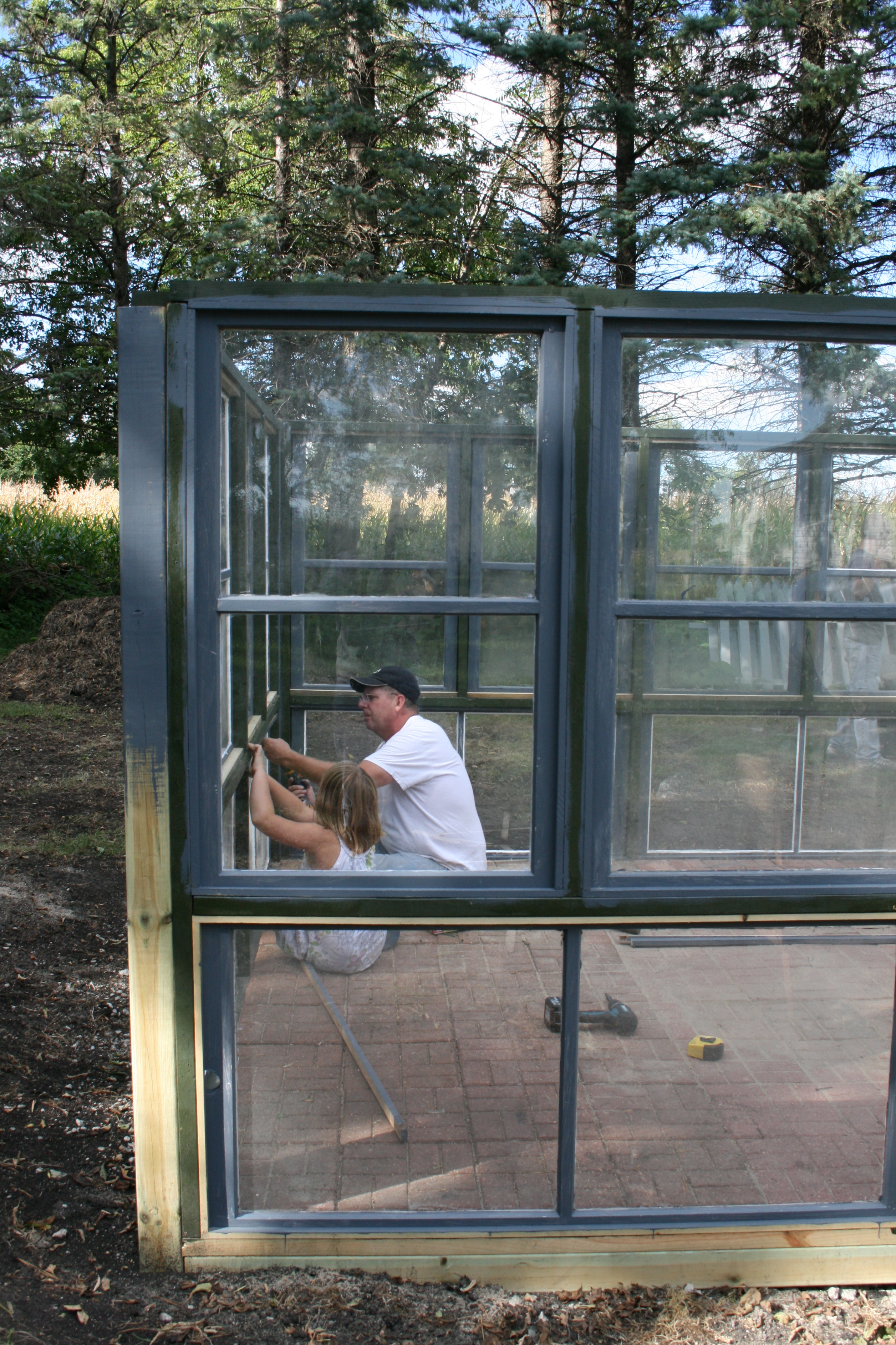 A collection of old windows purchased at a farm auction served as the start of the greenhouse layout.  I think they call this “farm fresh”