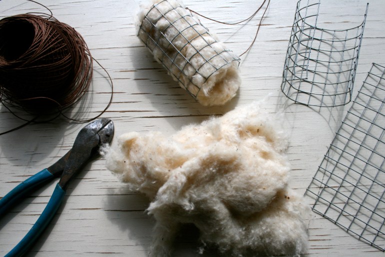 1/4″ hardware cloth is easily cut and rolled to hold some natural cotton batting.