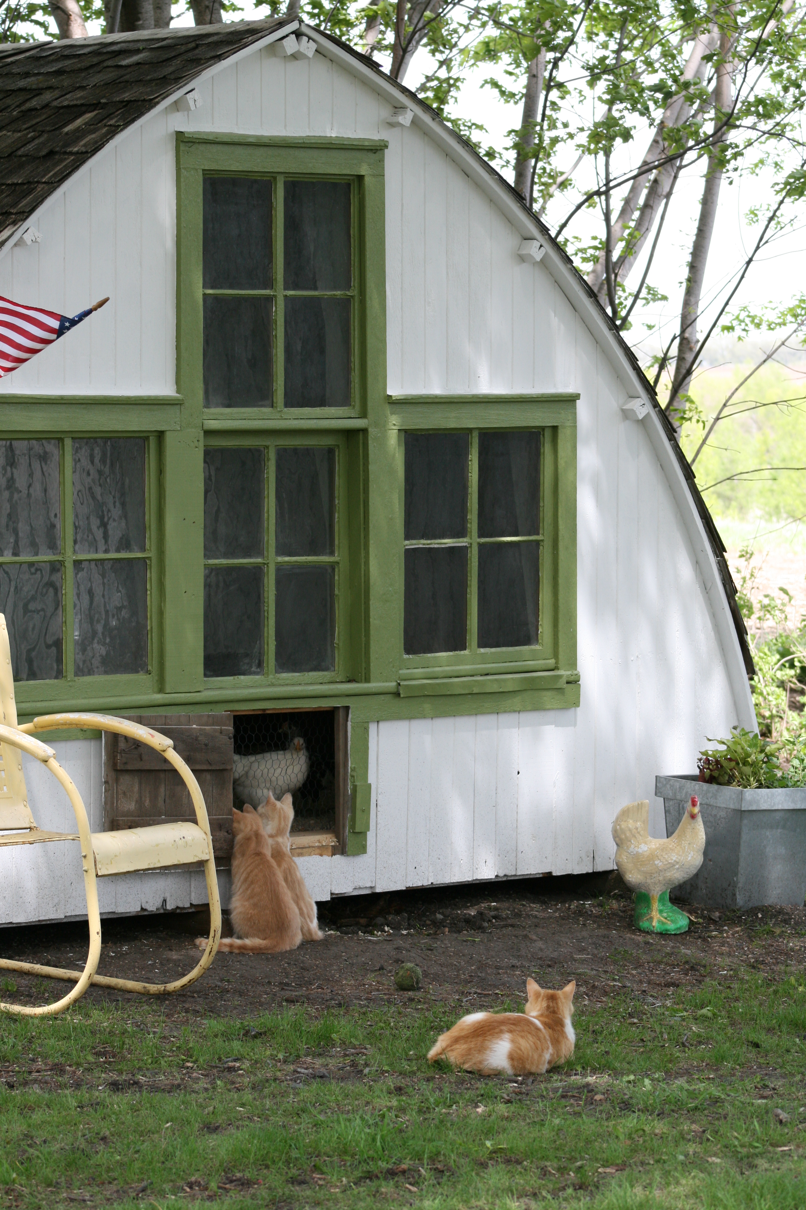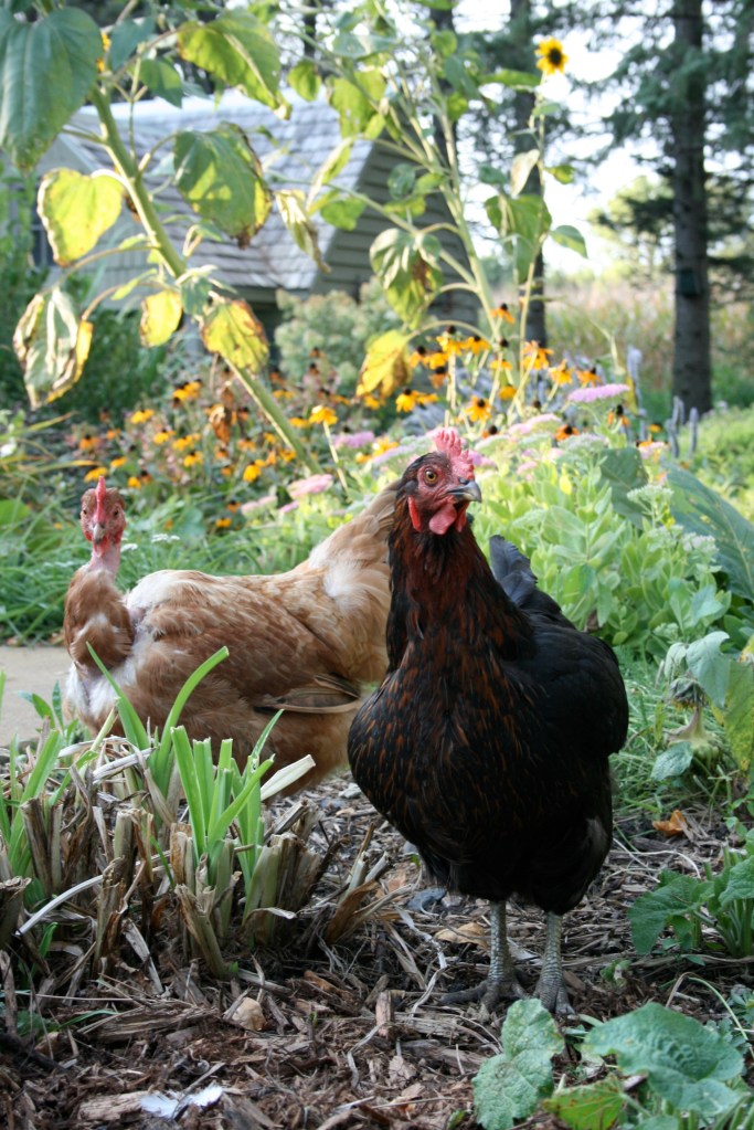 I can see from my small kitchen sink window, the scratching chickens in the coop.