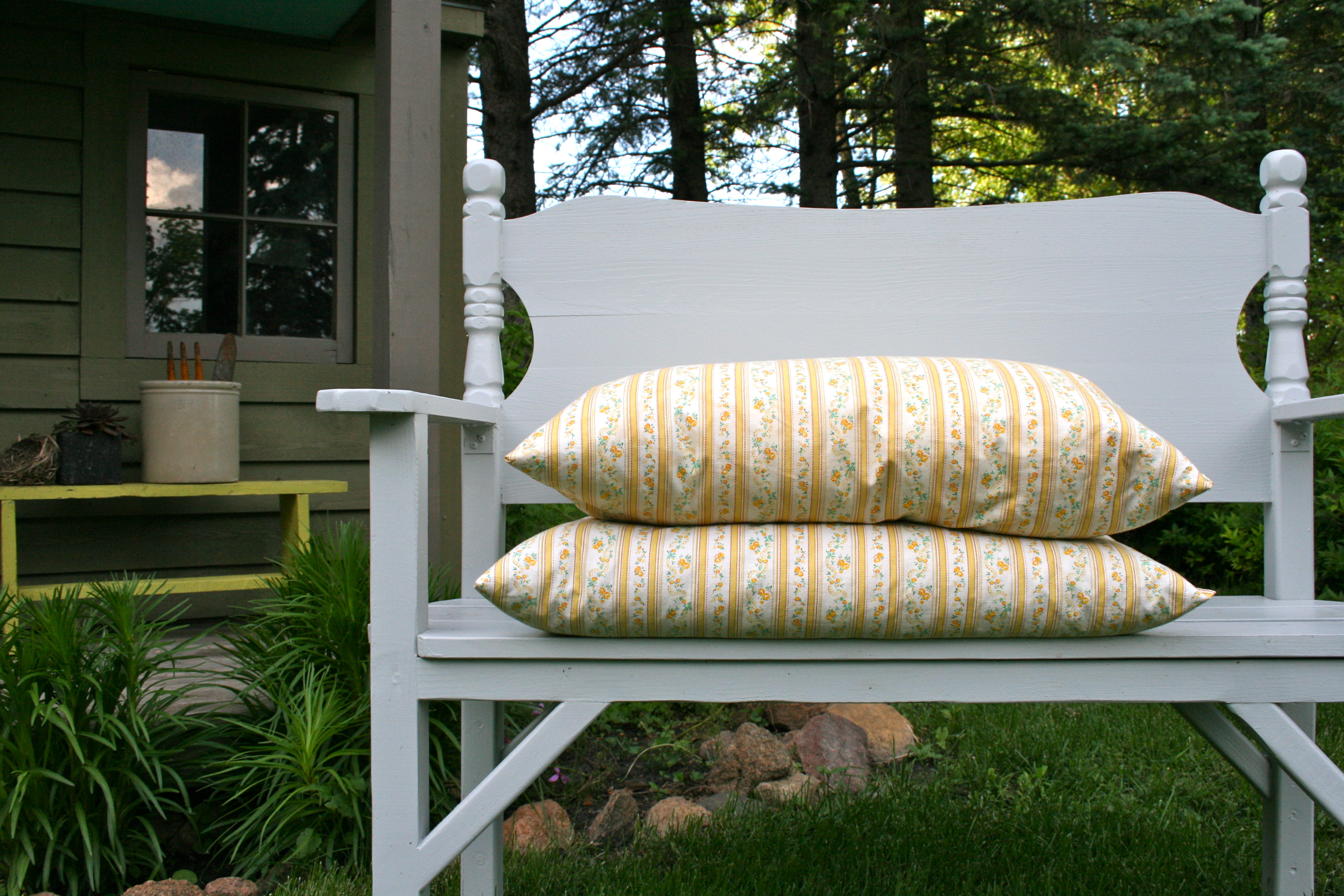 A perfect addition to Rabbit Run Cottage, I added a couple of vintage ticking feather pillows to take a little rest from garden chores.