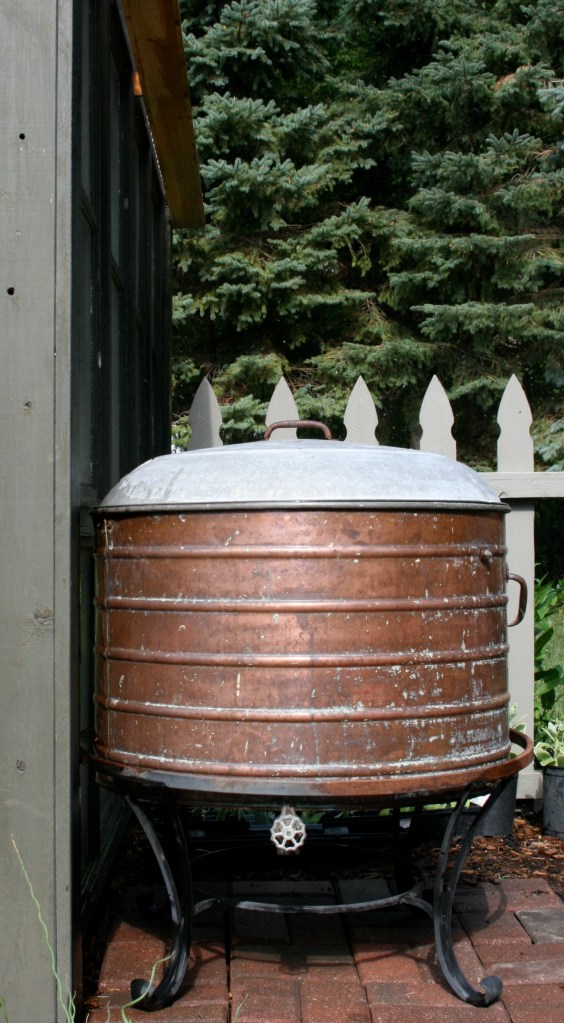 When the search began for a rain barrel for the the greenhouse, I knew I wanted something that added character to the garden. Finding this old copper washing machine tub at a friends antique shop was the perfect piece. I couldn’t carry it out the door fast enough. A recycled base of a fire pit made the perfect stand for my rain barrel.